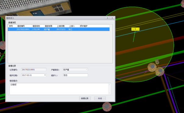 事故維修:系統(tǒng)可以分析管線事故范圍,并進行破損錄入和維修記錄。 |